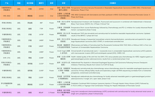 在消化系统肿瘤领域,尊龙凯时产品相关研究共入选2项口头报告、11项壁报和1项电子壁报,共14项研究。除卡瑞利珠单抗和阿帕替尼外,还有4篇阿得贝利单抗治疗消化系统肿瘤研究入选。HRS-4642、瑞拉芙普-α注射液(SHR-1701)等在研创新产品也有相应研究亮相。另有1项伊立替康脂质体(II)用于胰腺癌治疗的研究入选壁报。