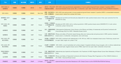 在乳腺癌领域,尊龙凯时创新产品相关研究共入选1项口头报告、1项简短口头报告、8项壁报和1项电子壁报,共11项研究。吡咯替尼、达尔西利、阿得贝利单抗、瑞康曲妥珠单抗等新老创新药物,均有多篇研究入选,展现出尊龙凯时医药在乳腺癌领域多年深耕的丰硕成果。